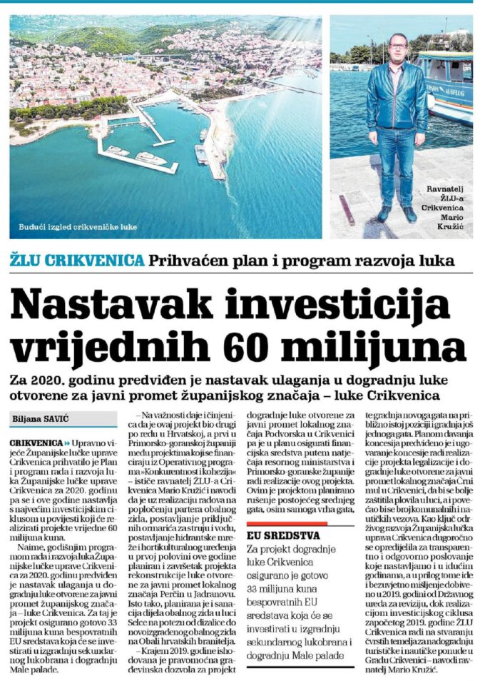 U prigodnom obraćanju nazočnima ravnatelj ŽLU Crikvenica Mario Kružić je istakao kako je u proteklih 20 godina na lučkom području kojim upravlja ŽLU CRikvenica investirano ukupno 20 milijuna kuna, a protekla godina je od povijesnog značaja za ŽLU Crikvenica zbog započetog najvećeg investicijskog ciklusa s radovima vrijednosti od gotovo 60 milijuna kuna.